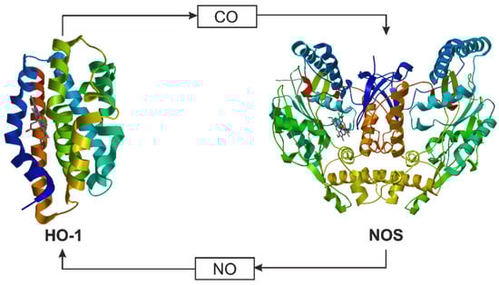 The metabolic gas cycle for CO and NO. The enzymes nitric oxide synthase (NOS: PDB ID: 4NOS, 2.25 Å [52]) and heme oxygenase 1 (HO-1: PDB ID: 4G98, 2.30 Å [58]) produce NO and CO, respectively, and NO and CO can enhance or inhibit enzyme activity, as dictated by cellular need [34].