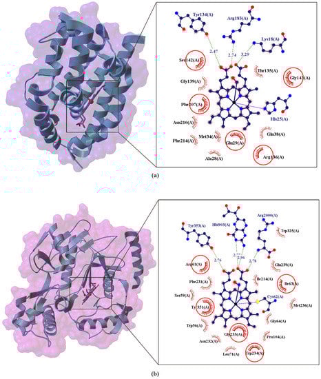 Comparison of the X-ray structure of Heme Oxygenase-1 (HO-1) binding carbon monoxide (CO) (a) and Nitric oxide synthase (NOS) binding nitric oxide (NO) (b) neurotransmitters in the heme region. The enlarged area shows the structural elements around the CO ligand binding site (PDB ID: 4G98, 2.30 Å) and NO ligand binding site (PDB ID: 2FC1, 2.00 Å) (b). Residues that form hydrogen bonds (dashed lines) with heme are shown in ball-and-stick representation with the interatomic distances shown in Å. Residues forming Van der Waals interactions with heme are shown as labeled arcs with radial spokes that point toward the ligand atoms. The red circles and ellipses identify equivalent residua (in 3D superposition of structures).