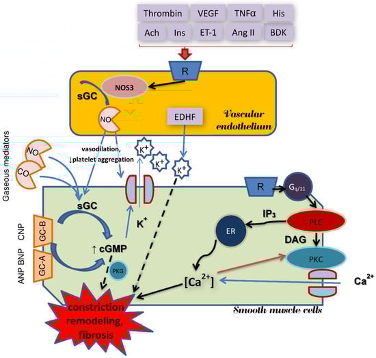 Schematic illustration of gaseous mediators’ intervention in function of vessel wall. Solid lines indicate stimulation processes, dashed lines—inhibition. Natriuretic peptide type A (ANP), B (BNP) and C (CNP); cyclic guanosine monophosphate (cGMP); diacylglycerol (DAC); endoplasmic reticulum (ER); membrane guanylate cyclase type A (GC-A) and B (GC-B); soluble guanylate cyclase (sGC); inositol 1,4,5-trisphosphate (IP3); endothelial nitric oxide synthase (NOS3); protein kinase C (PKC); cGMP dependent protein kinase G (PKG); phospholipase C (PLC); G protein-coupled receptor (R); Gq alpha subunit family (Gq/11); carbon monoxide (CO); nitric oxide (NO); potassium ion (K+); calcium ions (Ca2+); endothelium-derived hyperpolarizing factor (EDHF); stimuli activating NOS3: thrombin, bradykinin (BDK), vascular endothelial growth factor (VEGF), tumor necrosis factor (TNFα), histamine (His), acetylcholine (Ach), insulin (Ins), endothelin type 1 (ET-1), angiotensin II (Ang II).