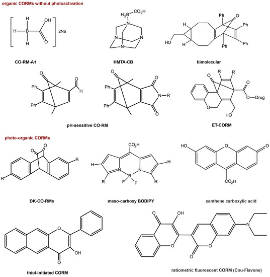 An alternative to the oral or injection administration of CO is CORM-stable solid complexes of CO [120]. Another classification of this group of compounds is based on the mechanism of CO release activation. This classification includes solvent-triggered CORMs, photo-CORMs, enzyme-triggered CORMs (ET-CORMs), thermal triggered CORMs, oxidation-triggered CORMs, pH-triggered CORMs, etc. [123]. The first generation of CORMs consists of organometallic compounds. They usually contain essential trace elements (especially Fe, Mg, Cr, Co, Mn, and Mo) as well as nonphysiological metals (Ru, Rh, W, Re, and Ir) surrounded by some carbonyl groups (CO) as coordinated ligands (Figure 7) [124,125]. Thus far, few organometallic compounds have been introduced as potential therapeutic agents. The research confirmed the difficulties of the therapeutic application of these compounds resulting from the physicochemical properties of these complexes, such as (i) weak or rapid dissolution in water, (ii) the uncontrolled release of CO (t1/2 < 1 min), (iii) the reactivity of metals with biological substances (e.g., nucleophilic and electrophilic chains side proteins), (iv) central metal toxicity [21,126,127]. Therefore, to avoid transition metals, nonmetallic CORMs were developed, becoming second-generation CORMs. As organic CO donors, initially, this class included systems containing boranocarbonates (H3BCO2), boranocarbamates (H3BCO), hexamethylenetetramine carboxyborane (HMTA-CB or HMTA-BH2COOH), methylene chloride (MC) [128,129]. However, boranocarboxylate derivatives generate BH3 and one equivalent of hydroxides upon CO release [127]; in recent years, other organic forms of CO delivery have been reported (Figure 8).