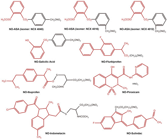 When the body cannot generate sufficient amounts of NO to maintain homeostatic functions, the administration of exogenous NO is a practical method of supplementation, e.g., in patients affected by osteoporosis [147]. As discussed previously, NOS2 and NO are produced as a part of the immune response and have a regulatory role. In various pathological states, e.g., during infection, NO is released by macrophages and other immune cells at concentrations above 1 μM, where it serves as a broad-spectrum biocide [10,148,149]. To effectively exploit these properties of NO, a new class of nitric oxide donating nonsteroidal anti-inflammatory compounds (NO-NSAIDs) was developed (Figure 9).