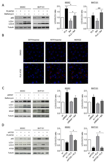 During autophagy, the cytoplasmic form of microtubule-associated protein 1A/1B-light chain 3 (LC-3), LC3-I, is converted into the lipidated and autophagosome membrane-targeted form, LC3-II, which is degraded in autolysosomes during late stage of the process. Then, as previously stablished, the LC3-II/LC3-I ratio is used as a reliable marker of autophagy; in the presence of a lysosomal inhibitor, an increase in LC3-II levels indicates an induction of autophagy [48]. On the other hand, the degradation of autophagy cargo receptor p62 protein levels is another marker of active autophagy. Thus, to investigate the role of V600EBRAF on autophagy in thyroid cancer, we first analysed both LC3-II/LC3-I ratio and p62 levels in 8505C and BHT101 cells after treatment with the V600EBRAF inhibitor, PLX4720. The results in Figure 1A showed that PLX4720 produced an increase in LC3-II/LC3-I ratio in both cell lines, whereas the decrease in p62 was only observed in BHT101 cells (Figure 1A). Further analysis in the presence of the autophagy inhibitor Bafilomycin A1 indicated similar effects, reinforcing the hypothesis that an increase in autophagy flux was induced by PLX4720 (Figure 1A).