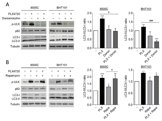 Remarkably, the degree of ULK1 phosphorylation at Ser555 were higher in PLX4720-treated cells than in control cells, indicating an increase in ULK1 activation following V600EBRAF inhibition (Figure 3A,B). Additionally, the presence of Dorsomorphin reduced the basal levels of phosphorylated ULK1 and, interestingly, reversed the increased levels of ULK phosphorylation achieved by PLX4720 treatment (Figure 3A), demonstrating that AMPK activates the initiation complex during autophagy. By contrast, the inhibition of mTOR by Rapamycin did not exert any effect under all conditions analysed (Figure 3B). These results suggest that V600EBRAF inhibition increases ULK1 phosphorylation through AMPK activation. Regarding LC3-II/LC3-I ratio, Dorsomorphin did not affect basal levels in 8505C andBHT101 cells, but this AMPK inhibitor reduced the increase in the ratio achieved by the single treatment with PLX4720 (Figure 3A). Accordingly, Dorsomorphin also reversed the decrease in p62 levels observed after V600EBRAF inhibition in BHT101 cells (Figure 3A). However, similar to the results obtained when ULK1 phosphorylation was analysed, mTOR inhibition with Rapamycin did not show any significant difference in both LC3-II/LC3-I ratio and p62 levels, neither in basal conditions nor in PLX4720-treated cells (Figure 3B).