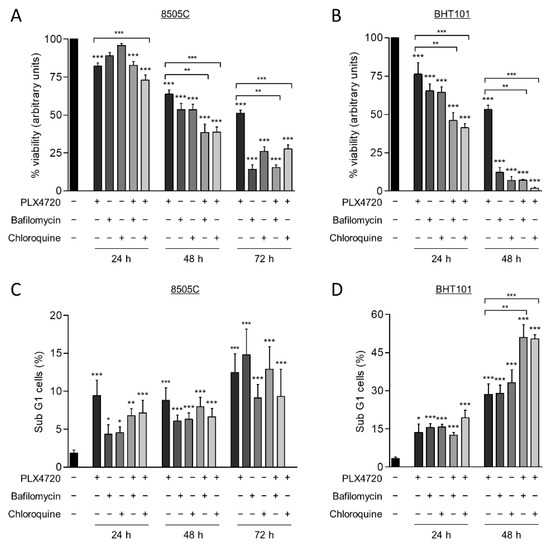 As expected, treatment with PLX4720, as a single agent, exerted a time-dependent reduction of cell viability in both cell lines, 8505C and BHT101 (Figure 4A,B). Similarly, both Bafilomycin A1 and Chloroquine also decreased cell viability in a time-dependent manner in both cell lines, although the effect was much greater in BHT101 cells than in 8505C cells. Accordingly, both autophagy inhibitors triggered a decrease in BHT101 cell viability of approximately 90% after 48 h treatment, whereas 8505C cells reached similar reduction after 72h treatment with each inhibitor (Figure 4A,B). Notably, we also observed that the effects on cell viability produced by the combination of autophagy and V600EBRAF inhibition were greater than the effects triggered by individual treatments. Again, higher sensitivity to these combinations was achieved in BHT101 cells than in 8505C cells (Figure 4A,B). All these results indicate that autophagy has a cytoprotective role in these thyroid cancer cells and that the inhibition of this process significantly enhances the cytotoxic efficacy of V600EBRAF inhibition.