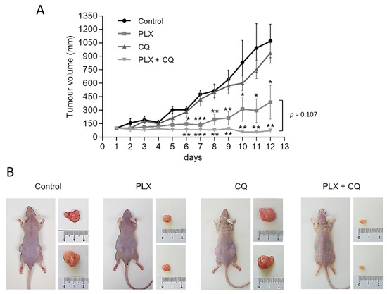 Autophagy inhibition enhances antitumor activity of PLX4720 BRAFi in vivo. Mice bearing subcutaneous BHT101 cells-derived xenografts on both flanks were randomly divided into four groups and treated intraperitoneal with vehicle (control), 25 mg/kg/day PLX4720 (PLX), 60 mg/kg Chloroquine (CQ) or combination of both (PLX + CQ) for 12 days. (A) Curves of tumour growth monitored by measuring the tumour volumes over time after the treatments. Data are shown as the mean ± SEM; n = 6. (B) Representative images showing mice from different treatment groups with tumours on day 12 of treatment. Significant differences compared to the corresponding untreated control: * 0.01 < p < 0.05, ** 0.001 < p < 0.01, *** p < 0.001.