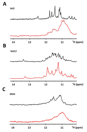 Imino regions of 1D 1H NMR spectra of Bcl2 (A), Tel21T (B), and KRAS (C), acquired in EC buffer in the absence (black) and the presence (red) of BRACO19. The spectra were measured at 20 °C. 1:2 DNA to ligand ratio was used for Bcl2, and 1:1 ratio for Tel21T and KRAS.