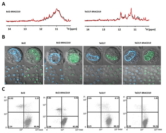 The targets, once passed through preliminary in vitro NMR screening, were subjected to further tests prior to in-cell NMR experiment [8,28]. To assess the impact of transfection procedure, the NMR spectra of the complex acquired before and after the electroporation step were compared in the absence of cells. Figure 2A shows 1D 1H NMR spectra of the Bcl2–BRACO19 and Tel21T–BRACO19 complexes measured in EC buffer before and after the “mock” electroporation. For both complexes, the spectra before and after the mock electroporation were essentially identical. This experiment confirmed that the electroporation does not compromise the integrity of either the complexes or the DNAs.