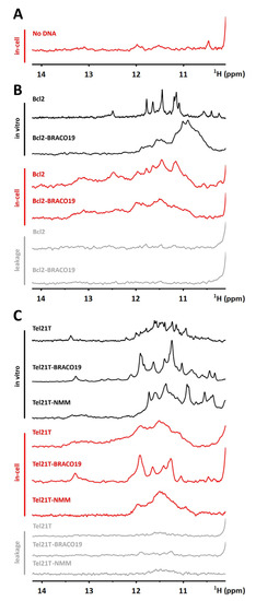 (A) Imino region of 1D 1H NMR spectra of “empty” RPE cells. (B) Imino regions of 1D 1H NMR spectra of Bcl2 and Bcl2–BRACO19 complex acquired in EC buffer (black line) and cells (red line). (C) Imino regions of 1D 1H NMR spectra of Tel21T, Tel21T–BRACO19, and Tel21T–NMM complex acquired in EC buffer (black line) and cells (red line). NMR spectra presented in gray in (B,C) correspond to the respective in-cell NMR leakage controls.
