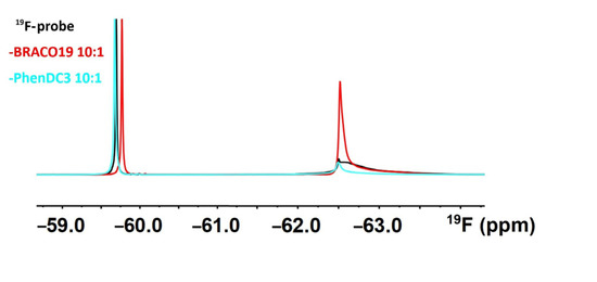 The application of the 19F-probe to monitor G4–ligand interactions implicitly presumes that the probe reports exclusively on the structure of the target. In other words, it presumes that the probe is not interacting with the ligand. Therefore, we acquired the 1D 19F in vitro NMR spectra of the 19F-probe (detached from the DNA) in the ligand (BRACO19, PhenDC3) absence and presence. As shown in Figure 5, ligand BRACO19 changed the appearance of the 19F NMR spectrum of the free tag, suggesting a possible interaction. Adding BRACO19 leads to both ~0.1 ppm shift of the probe signal and a new signal’s appearance at ~−62.5 ppm, implying (likely stacking) interaction of BRACO19 with the probe’s aromatic ring. The interactions between the probe and a ligand might, to some extent, bias in-cell NMR spectra interpretation and contribute to the 19F signal broadening in the in-cell NMR spectra.