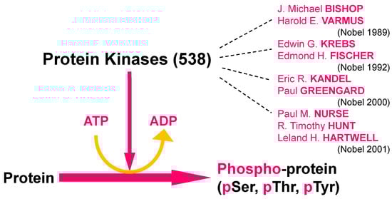 Four Nobel Prizes in Physiology or Medicine awarded in the field of protein phosphorylation and protein kinases. Protein kinases catalyze the transfer of the γ-phosphate of ATP to the hydroxyl substituents of serine, threonine, or tyrosine residues in proteins, thereby altering the physiological properties of their protein substrates. The human kinome comprises 538 protein kinases. Michael Bishop and Harold E. Varmus received the Nobel Prize 1989 “for their discovery of the cellular origin of retroviral oncogenes” (src, the first described oncogene, which encodes a tyrosine kinase). Edmond H. Fischer and Edwin G. Krebs received the Nobel Prize 1992 “for their discoveries concerning reversible protein phosphorylation as a biological regulatory mechanism” (they are the true discoverers of protein kinases). The Nobel Prize 2000 was awarded jointly to Arvid Carlsson, Paul Greengard, and Eric R. Kandel “for their discoveries concerning signal transduction in the nervous system” (Paul Greengard investigated the mechanism of signal transduction of neurotransmitters in the central nervous system and demonstrated the key importance of phosphorylation by kinases such as CDK5, PKA, CK1, and CK2 and Eric Kandel the importance of PKA in memory in Aplysia). The Nobel Prize 2001 was awarded jointly to Leland H. Hartwell, Tim Hunt, and Paul M. Nurse “for their discoveries of key regulators of the cell cycle” (using yeast or sea urchin embryos, they discovered how the cell division cycle is regulated by CDKs). For more information on each of these awardees, see: https://www.nobelprize.org/prizes/medicine/ (accessed on 1 June 2021).
