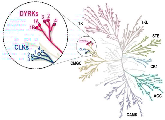 DYRKs and CLKs within the human kinome phylogenetic tree. DYRK and CLK family members are highlighted with pink and blue circles, respectively. Kinome tree: courtesy of Cell Signaling Technology, Inc. (Danvers, MA, USA, www.cellsignal.com, accessed on 1 June 2021). AGC, cAMP-dependent protein kinase (PKA), cGMP-dependent protein kinase (PKG), and protein kinase C (PKC) families; CAMK, Ca2+/calmodulin-dependent kinases; CK1, casein kinases 1; CMGC, cyclin-dependent kinases (CDKs), mitogen-activated protein kinases (MAPK), glycogen synthase kinases (GSK3), dual-specificity, tyrosine phosphorylation-regulated kinases (DYRKs) and Cdc2-like kinases (CLKs); STE, homologs of yeast STE20 (MAP4K), STE11 (MAP3K), and STE7 (MAP2K) kinases; TK, tyrosine kinases; TKL, tyrosine kinase-like kinases.