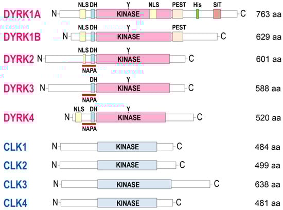 Among serine/threonine kinases, DYRKs and CLKs (Figure 2, Figure 3 and Figure 4) belong to a family of 62 kinases known as the CMGC group, which also includes mitogen-activated protein kinases (MAPKs), cyclin-dependent kinases (CDKs), and the glycogen synthase kinases 3 (GSK3) family. DYRKs and CLKs are two highly related and conserved kinase families (Table 1), usually sensitive to the same pharmacological inhibitors. The DYRK family comprises 5 members: DYRK1A and DYRK1B (class 1 DYRKs) and DYRK2, 3, and 4 (class 2 DYRKs) (reviews: [,,]). The CLK family comprises 4 members: CLK1, 2, 3, and 4 (review: []).