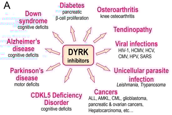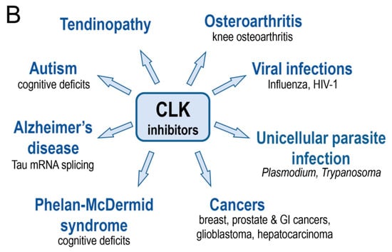 DYRK and CLK inhibitors and their potential use. (A) DYRK inhibitors (in particular inhibitors of DYRK1A) have been investigated in the indicated diseases. (B) CLK inhibitors (in particular inhibitors of CLK1) have been investigated in the indicated diseases.