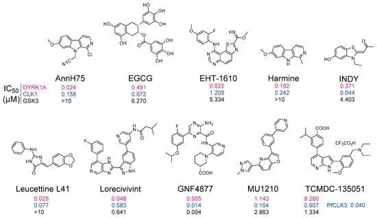 Crystal structures of various DYRKs and CLKs, alone or in complex with inhibitors, have been solved (Table 2). These structures have allowed a detailed understanding of the mechanism of activation of DYRKs by autophosporylation on the tyrosine residue as well as an understanding of the binding mode of numerous inhibitors, providing very useful information for the structure-guided synthesis of improved pharmacological inhibitors.