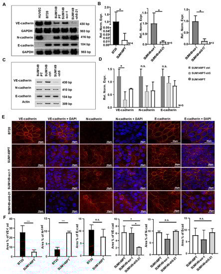 Expression of VE-, N- and E-cadherin in BT20, SUM149PT, SUM149-scr-1, SUM149-sh5-21, SUM149 ctrl and SUM149-sh5 cells, as detected by RT-PCR, qRT-PCR and immunofluorescence analysis. (A) VE-, N- and E-cadherin mRNA expression by RT-PCR. (B) Quantification of VE-cadherin mRNA by qRT-PCR. Relative normalized expression (Rel. Norm. Expr.). (C) VE-, N- and E-cadherin mRNA expression as observed by RT-PCR. (D) Quantification of VE-, N and E-cadherin mRNA by qRT-PCR. Relative normalized expression (Rel. Norm. Expr.). (E) Immunofluorescence analysis of VE- N-, and E-cadherin. Nuclear staining with DAPI, 40x magnification (F) Area in percent (area in %) positive for VE-, N-and E-cadherin immunofluorescence. For calculation, two to five random spots of the images were used. Bars represent standard deviation; n.s. not significant, * p < 0.5, *** p ≤ 0.001; statistical analysis was conducted using unpaired Welch’s t-tests.