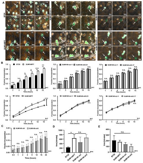The incorporation of SUM149 cells into the HUVEC monolayer is VE-cadherin independent. 50,000 tumor cells (green) were stained with CellTracker Green and placed on a confluent HUVEC monolayer (orange), fluorescently labeled with CellTracker Orange. The incorporation was recorded over 15 h with a microscope focused on the HUVEC monolayer. (A) The BT20, SUM149PT, SUM149-scr-1, SUM149-sh5-21 and SUM149-sh5-17 cells (white arrows) moved into the focus plane of HUVEC and incorporated into the endothelium. 40x magnification. Time in h:min after the beginning of the experiment is indicated; (B) Fraction of Incorporation at 1, 3, 6, 9, 12 or 15 h after the start of experiment; (C) 20,000 tumor cells were placed on a HUVEC monolayer, and their incorporation was recorded over 20 h with microscope focus on the HUVEC plane. Fraction of Incorporation 0.5, 1, 2, 4, 8, 12, 16 and 20 h after the start of the experiment; (D) Incorporation inception times do not depend on VE-cadherin as analyzed by live cell imaging (E) Duration of incorporation is VE-cadherin independent as calculated by live cell imaging. Bars represent standard deviation; n.s. not significant, * p ≤ 0.05; ** p ≤ 0.01; *** p ≤ 0.001; statistical analysis was conducted using one-way and two-way ANOVA.