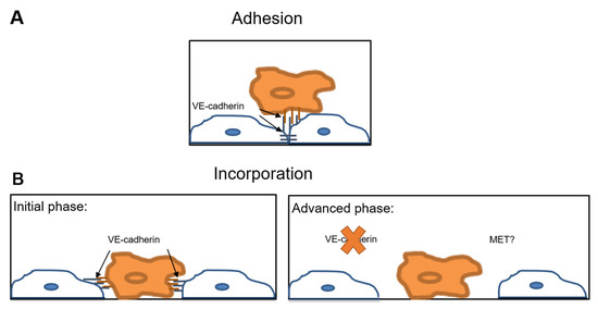 VE-cadherin interactions at the tumor cell-endothelial cell interface. Hypothetical model illustrating the VE-cadherin mediated interactions between tumor cells and endothelial cells during extravasation. (A) The adhesion of the tumor cell (orange) to the endothelial cell (blue) is mediated by the homophilic interaction between VE-cadherin on tumor cells and endothelial VE-cadherin. VE-cadherin facilitates tumor cell adhesion to the endothelium; (B) Initial incorporation phase: adherent tumor cells (orange) incorporate into the endothelium (blue). VE-cadherin might be involved in this initial phase of incorporation after mediating the contact between tumor and endothelial cells. Advanced phase: In the course of incorporation, endothelial cells (blue) downregulate VE-cadherin at the sites of contacts to the tumor cells (orange). The disruption of the VE-cadherin mediated endothelial cell contacts creates a gap in the endothelial layer through which tumor cells can transmigrate paracellularly. MET, mesenchymal-to-epithelial transition at the site of metastasis.