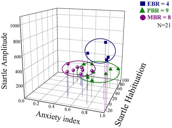A broad range of variations in behavioral responses was observed in PSS-exposed animals, and several subgroups were thus identified (Figure 2). Accordingly, the animals were subdivided into groups reflecting the magnitudes of responses (including EBR, PBR, and MBR) according to the CBC model. Overall, approximately 19% of the exposed animals (n = 4/21) fulfilled criteria for PTSD-phenotype (EBR); 38% (n = 8/21) for MBR; and 43% for PBR (n = 9/21).