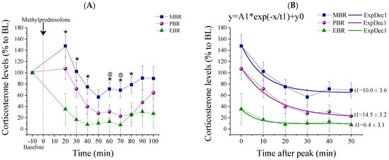 Corticosterone measurements post-MPST. Corticosterone measurements following MPST depicted as percentages from the baseline between the different CBC groups. (A) Measurements starting at 10 min before methylprednisolone injection (baseline) and 20 min after methylprednisolone injection, at 10 min intervals over a period of 90 min, points are averaged within each group (* MBR ≠ EBR, p < 0.04; @ MBR ≠ PBR p < 0.05; mean ± SEM). (B) A nonlinear fitting decay model carried out on the 6 time points following corticosterone peak concentrations indicated significantly different decay constants (t1) between groups, such that EBR rats exhibited a slower decay in corticosterone levels than MBR and PBR rats.