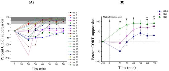The percent of corticosterone suppression post-MPST. Corticosterone suppression in 10 min intervals over 60 min following MPST, depicted as a percentage of suppression from the baseline. (A) The percentage of suppression plotted for all individual rats. (B) The percentage of suppression between the different CBC groups (* MBR ≠ EBR, p < 0.04; @ MBR ≠ PBR p < 0.05; mean ± SEM).