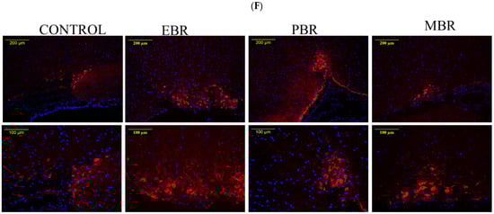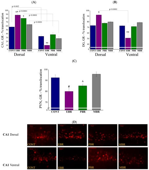 In the DG (Figure 6B), a two-way ANOVA revealed a significant main effect on groups (F(3, 52) = 2.96, p < 0.045), a significant effect on the hippocampus axis (F(1, 52) = 13.0, p < 0.0007) and a significant group–axis interaction (F(3, 52) = 27.2, p < 0.0001) on the nuclear translocation profile of MR protein. Bonferroni post hoc tests confirmed significantly higher MR-positive cells in the dorsal DG areas in EBR compared with unexposed control (p < 0.0007), PBR (p < 0.02), and MBR (p < 0.0015) rats. In contrast, significantly lower MR-positive cells were found in the ventral DG areas in EBR compared with unexposed control (p < 0.0001) and MBR (p < 0.0001) rats. In addition, in EBR and MBR rats, the expression of MR-positive cells was region-specific: EBR rats exhibited significantly higher MR-positive cells in the dorsal hippocampus compared to the ventral part (p < 0.0001), whereas the MBR rats exhibited significantly higher MR-positive cells in the ventral hippocampus compared to the dorsal part (p < 0.0001). In the PVN (Figure 6C), no significant differences were found between exposed groups, however, all exposed groups exhibited significantly lower GR translocation compared to unexposed controls (EBR: p < 0.0085, PBR: p < 0.008 and MBR: p < 0.015) (One-way ANOVA: F(3, 26) = 6.8, p < 0.0015).