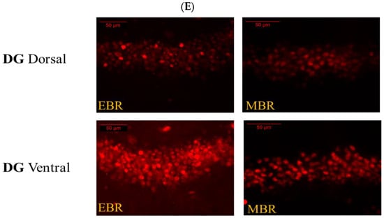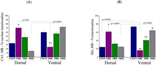 As noted above, hippocampal MR is also thought to play a principal role in the negative feedback effects of glucocorticoids, primarily on the basal HPA tone at both the trough and peak of the diurnal cycle []. In the CA1 subregion (Figure 6A), two-way ANOVA revealed a significant effect on the hippocampus axis (F(1, 52) = 6.0, p < 0.02), and a groups–axis interaction effect (F(3, 52) = 16.4, p < 0.0001). No effects were observed for groups. Bonferroni post hoc tests confirmed significantly higher MR-positive cells in the nuclear layer of the dorsal CA1 areas in EBR compared with unexposed control (p < 0.03) and MBR (p < 0.00015) rats. In contrast, significantly lower MR-positive cells were found in the ventral CA1 areas in EBR compared with unexposed control (p < 0.045) and MBR (p < 0.0025) rats. In addition, in EBR and MBR rats, the expression of MR-positive cells was region-specific: EBR rats exhibited significantly higher MR-positive cells in the dorsal hippocampus compared to the ventral part (p < 0.05), whereas the MBR rats exhibited significantly higher MR-positive cells in the ventral hippocampus compared to the dorsal part (p < 0.0001).