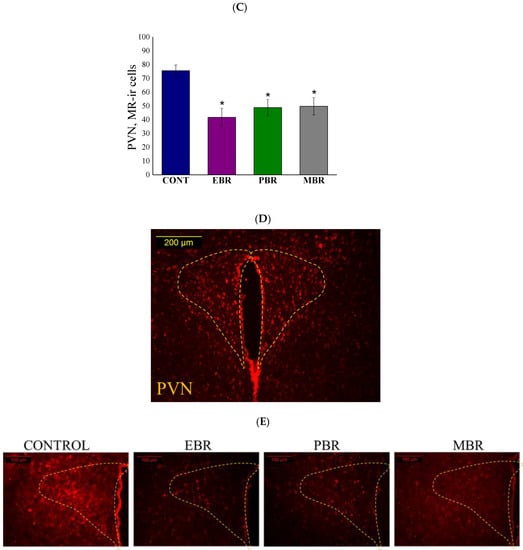 Brain MR-ir cells 8 days post-PSS exposure. Immunohistochemistry of MR in specific brain areas 8 days post-PSS exposure. Significant differences between dorsal and ventral parts are depicted in the graphs, whereas notations are given for significant differences between groups in the same area and explained in this legend for each graph separately. (A) MR-IR in the CA1 region of the ventral and dorsal hippocampus [* significant as compared to dorsal control and MBR (p < 0.03); ** significant as compared to ventral control and MBR (p < 0.045)]. (B) MR-IR in the ventral and dorsal dentate gyrus [* significant as compared to dorsal control, PBR and MBR (p < 0.02); ** significant as compared to ventral control (p < 0.001); @ significant as compared to ventral EBR and PBR (p < 0.02)]. (C) MR-IR in the PVN [* significant compared to control (p < 0.015)]. Panel (D) shows a schematic drawing of the regions of the PVN from which the measurements were collected. The image was acquired at 10× magnification. Scale bar: 200 μm. Additionally, in (E), there are representative images of MR-immunoreactivity in the PVN region of CONT, EBR, PBR, and MBR groups. Images were acquired at 20× magnification. Scale bar: 100 μm. The cells in red are MR-positive.
