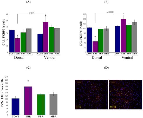 The FK506-binding protein-51 (FKBP5; fkbp5 gene) regulates HPA negative feedback by preventing nuclear translocation of the GR complex (100,352). Therefore, we examined the protein levels of FKBP5 in the cytosolic fraction of ventral, dorsal hippocampus, and PVN. In the CA1 (Figure 7A) and DG (Figure 7B) subregions, two-way ANOVA revealed a significant effect for hippocampus axis [F(1, 52) = 8.5, p < 0.0055 and F(1, 52) = 26.8, p < 0.0001, respectively], and a group–axis interaction effect [F(3, 52) = 6.2, p < 0.0015 and F(3, 52) = 5.8, p < 0.002, respectively]. No effects were observed for groups. Bonferroni post hoc tests confirmed significantly lower FKBP5-positive cells in the dorsal CA1 and DG subregions in EBR compared with unexposed control (p < 0.05 and p < 0.0015, respectively), MBR (p < 0.01 and p < 0.04, respectively) and PBR (p < 0.04, only in the DG) rats. Furthermore, significantly higher FKBP5-positive cells were found in the ventral CA1 subregion in EBR rats compared with unexposed controls (p < 0.05). In addition, significantly lower FKBP5-positive cells were found in EBR rats in the dorsal subregions compared with ventral parts (p < 0.04 and p < 0.0001, respectively). In the PVN (Figure 7C), EBR rats exhibited significantly higher FKBP5-ir cells compared to controls (p < 0.0025) (One-way ANOVA: F(3,26) = 5.7, p < 0.004).