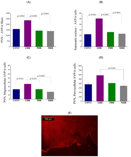 Brain AVP levels 8 days post-PSS exposure. Immunohistochemistry of AVP 8 days post-PSS exposure. (A) Levels of AVP in overall fibers in the PVN. (B) Levels of AVP in the overall cells of the Supraoptic nucleus. (C) Levels of AVP in magnocellular neurosecretory cells in the PVN. (D) Levels of AVP in magnocellular neurosecretory cells in the PVN. Significant values are shown in the graphs. Panel (E) shows a schematic drawing of the region of the SON from which the measurements were collected. (F) Representative images of AVP-immunoreactivity in the SON region of CONT, EBR, PBR, and MBR groups are also shown. Images were acquired at 10× magnification. Scale bar: 200 μm. The cells in red are MR-positive.