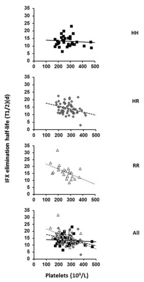 Relationship between IFX elimination and platelet count in FCGR2A HH, HR and RR genotyped patients. The IFX t1/2 and baseline platelet counts were evaluated in 31 HH, 53 HR and 23 RR individuals and all participants. Correlation is represented on each graph by the linear regression line (HH: y = −0.004x + 14.237, R2 = 0.0069; HR: y = −0.0182x + 19.156, R2 = 0.1095 and RR: y = −0.0368x + 25.567 R2 = 0.2534).
