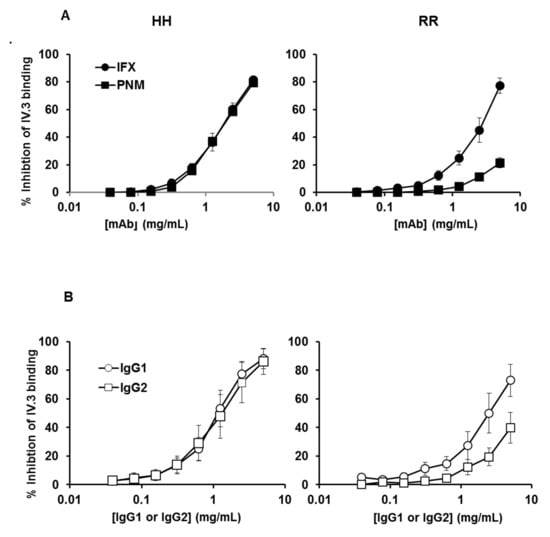 The inhibition profiles with the two mAbs on platelets from HH donors were strictly similar: a concentration of about 1.5 mg/mL for each mAb was sufficient to achieve 50% inhibition. The profiles were different when platelets from RR donors were used (Figure 2A right): as compared with IFX, PNM less potently inhibited the binding of IV.3 mAb. An IFX concentration of about 2.5 mg/mL was required to achieve about 50% inhibition, whereas a similar PNM level led to about 10% inhibition. These findings confirm the results obtained previously with cetuximab and PNM [30].