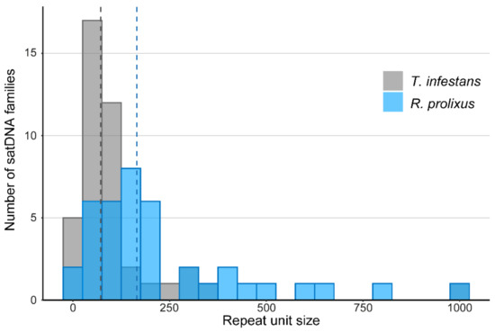 Repeat unit size distribution on Rhodnius prolixus and Triatoma infestans. Dashed lines represent median value of repeat unit size for R. prolixus (163 bp) and T. infestans (72 bp).