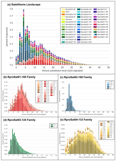 (a) Satellitome landscape of the satDNA families in Rhodnius prolixus. In the landscape, abundance vs. Kimura divergence from satDNA consensus sequences is plotted. (b–e) Landscape of most abundant satDNA families divided by their subfamilies. The order of satDNA families and subfamilies are in order of their position on a stacked histogram.