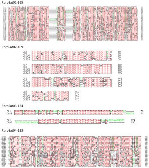 Consensus sequences alignments of the different subfamilies found for the most abundant satDNA families in Rhodnius prolixus. Boxed red letters correspond with conserved position among sequences. Less conserved positions are indicated with green and black letters.