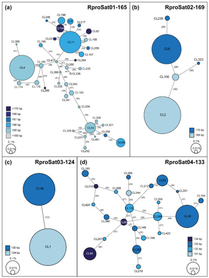 Minimum spanning networks for the four satDNA families forming superclusters in Rhodnius prolixus: (a) RproSat01-165, (b) RproSat02-169, (c) RproSat03-124 and (d) RproSat04-133. Numbers between brackets are the mutational steps. Each circle corresponds to a RepeatExplorer2 cluster or subfamily, where the size is proportional to its abundance in the genome. Colors denote the consensus monomer length.