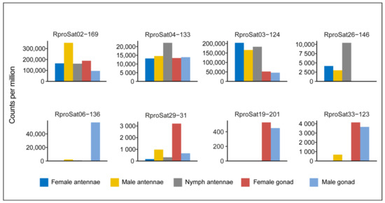 The possible role of transcripts of satDNA has been questioned in the past, but accumulation of evidence has changed that view. Currently, it is widely accepted that satellite non-coding RNAs might have functions in different cellular contexts, such as cancer, stress response, development or cell proliferation [32,33,56]. Hence, we have analyzed whether satDNA families of R. prolixus are transcribed in different tissues. Samples from two available RNA-seq experiments from tissues were selected. The first one was an RNA-seq analysis of antenna, the main chemosensory structures in insects, performed in nymph, male and female (SRX1011796, SRX1011778 and SRX1011769, respectively), and the second one, an RNA-seq analysis performed in female and male gonads (SRX6380683 and SRX6380682, respectively). Due to the taxonomy identification issue commented on above, the ITS2 region sequence was obtained from each dataset in order to check the correct species classification (Supplementary Figure S3). After mapping dataset reads to our satDNA consensus sequences, satDNA families poorly represented were discarded and read count was normalized. Library preparation for RNA-sequencing is highly decisive for results. Therefore, library selection from antenna was random, while enrichment for messenger RNA sequences was applied at gonads library. Bearing that in mind, comparison between experiments should be made with caution since non-coding RNA could probably be under-represented on gonads samples, and satDNA transcription could be underestimated. We found that 33 satDNA families were transcribed at least in two samples (Figure 7 and Supplementary Figure S6, Table S2), showing four different patterns. The first pattern would correspond to satDNA families transcribed in all studied tissues (antenna, ovaries and testis), although with different proportions, such as RproSat02-169 and RproSat04-133. The second pattern would represent satDNA families highly transcribed in antenna, with less or no transcription in gonads, such as RproSat03-124 and RproSat26-146. The third pattern would correspond to satDNA families highly transcribed in gonads, such as RproSat19-201 and RproSat33-123. Finally, the fourth pattern would belong to satDNA families highly transcribed in one gonadal tissue only, such as RproSat06-136 (testis) and RproSat29-31 (ovaries). Additionally, the transcription level of satDNA families appears to be significantly correlated with their abundance, whether combined transcription (Spearman’s correlation rs = 0.52, p = 0.002) or tissue transcription (Supplementary Table S3) is considered. However, one exception should be pointed out, the Rpro34-415 family. This family, which represents only 0.003% of the genome, showed transcription levels similar to the most abundant families, being higher at male antennae and gonads. Together, those results indicated the satellitome is generally expressed in R. prolixus, although each family is transcribed at a different level and at a different pattern, suggesting that satDNA transcription could have a specific role in those tissue environments. Satellite DNA transcription is an accepted feature, as we commented on above, and it has been seen before in other insects, such as Coleoptera [57,58,59], Hymenoptera [60,61,62], Orthoptera [19], Lepidoptera [63] or Diptera [33,34,64]. In D. melanogaster, Mills et al. [34] found that satDNA derived from (AAGA)n tandem repeat is highly transcribed at neuron and testis, being necessary for male fertility. Another D. melanosgaster satDNA, the 1.688 satDNA family, contains a member with a dense X-linked distribution (1.688X), which plays an important role in marking the X chromosome during dosage compensation [65]. In males, the small interfering RNAs generated from 1.688X sequences promote X localization of the male-specific lethal complex, which increases X-linked gene expression by modification of chromatin [38,63]. In D. buzzatti and D. mojavensis, satDNA families pBuM and CDSTR198 were transcribed, particularly in pupae and male tissues, even when both satDNAs have different genomic environment (heterochromatin and euchromatin, respectively) [64]. Outside of insects, satDNA has proven their importance. For instance, in humans, SATIII is associated with cell response to stress, recruiting RNA-processing factor and downregulating cellular transcription [32]. Our findings suggest that satDNA transcription might have functionality on the R. prolixus genome and open the door to future studies to address whether those satDNAs contribute to gene regulation or chromatin modulation.