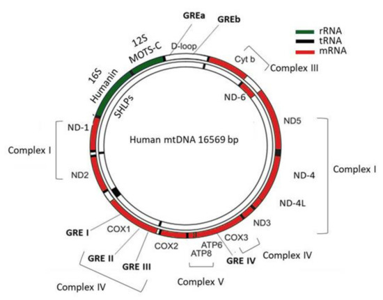 The human mitochondrial genome. The human mitochondrial genome consists of a circular, double-stranded DNA of 16.569 bp. It encodes two ribosomal RNAs (12S and 16S), 22 tRNAs, and 13 mitochondrial proteins involved in the respiratory complexes; ND1, ND2, ND3, ND4, ND4L, ND5, ND6 encode subunits of the complex I, COX1, COX2, COX3 of the complex IV, CYTB of the complex III, and ATP6, ATP8 of the complex V. Three mitochondrial GREs reside in COX1 gene, one in COX3 and two within the D-loop. MOTS-c is encoded by ORFs within 12S rRNA while Humanin and SHLPs by ORFs within 16S rRNA.