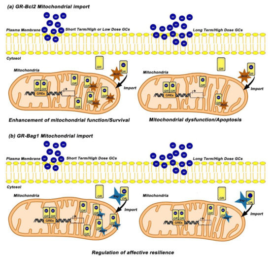To further elucidate the underlying mechanisms, Du et al. investigated the interaction between Bcl-2 protein and GRs in response to Cort treatment and they revealed that acute treatment with low or high doses of Cort leads to increase of the GR/Bcl-2 complex into mitochondria while long-term and high-dose treatment with Cort results in downregulation of GR/Bcl-2 levels in mitochondria. Furthermore, treatment with RU486 blocked the acute and high Cort-induced effects on mitochondrial function as well as mitochondrial translocation of GRs in primary cortical neurons, suggesting that these effects are mediated through GRs [27]. The same research group carried out in vivo studies and revealed that prefrontal cortex (PFC) of treated rats with long-term high and low doses of Cort, exhibit lower mitochondrial levels of GRs while high dose Cort-treated mice exhibit also reduced mitochondrial Bcl-2 levels [27]. Based on above data, Du et al. suggested a possible role of mitochondrial GR in underlying mechanism(s) in chronic stress-induced apoptosis [64]. According to this mechanism, GR/Bcl-2 complex translocates into mitochondria and regulates mitochondrial function and neuronal viability/apoptosis in a biphasic manner; under physiological conditions, GCs enhance mitochondrial function and neuroprotection through an increase of the mitochondrial GR/Bcl-2 complex whereas under chronic stress conditions GCs attenuate mitochondrial function and induce neurotoxicity through decrease of the mitochondrial GR/Bcl2 complex. Given that Hsp70 mediates protein mitochondrial translocation [65] whereas Bag-1 attenuates nuclear translocation of GR and potentiates the anti-apoptotic function of Bcl-2 [66,67], Du et al. hypothesized that GR/Bcl2 mitochondrial translocation can be mediated via its binding to GR chaperones, heat shock protein 70/90 (Hsp70/90) and Bag-1 (Figure 2a) [64].