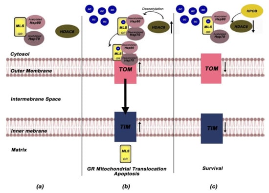 The involvement of HDAC6 and mitochondrial translocation machinery in GR import into mitochondria. (a) In unliganded state, GR is located into the cytoplasm complexed with low affinity to acetylated GR chaperones (Hsp70, Hsp90). (b) Cort treatment enhances the expression levels of HDCA6 and decreases the levels of Hsp90/70. HDCA6 triggers the deacetylation of Hsp70 and Hsp90, enhancing the affinity of GR complex for GC and favoring GR translocation into mitochondria. Cort also induces upregulation of the outer and inner membrane mitochondrial machinery (TOM and TIM), thus leading to GR import into mitochondria and inducing apoptosis processes. (c) HPOB treatment attenuates GR mitochondrial translocation through inhibiting HDAC6. HPOB triggers hyperacetylation of Hsp70 and Hsp90 and reverses the Cort-induced upregulation of HDCA6 and reduction of Hsp70 and Hsp90. Hsps hyperacetylation inhibits the binding between the multi-chaperone complex and Tom70, blocking the mitochondrial GR translocation and Cort-induced apoptosis [69,72]. GCs; Glucocorticoids, GR; Glucocorticoid Receptor, MLS; Mitochondrial localization signal, Hsp; Heat Shock Proteins, HDAC6; Histone Deacetylase 6.