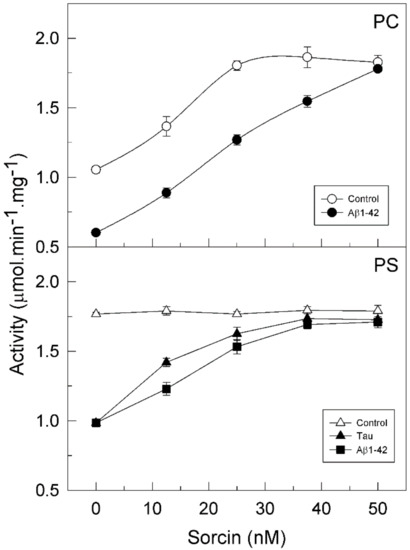 To our knowledge, this is the first study to show the functional effects of sorcin on the plasma membrane Ca2+ pump from human and pig brain and also from neuroblastoma cells. This pump is highly regulated, and is the only Ca2+-transport ATPase which is activated by CaM [50]. The pig brain PMCA purified by CaM-affinity chromatography is eluted in a delipidated state, and therefore lacks its activity. To activate the pump, it is necessary to reconstitute it with lipids [24]. The lipid nature is a key factor in the function of membrane proteins. We and other authors have shown that in the presence of PC, the protein is partially active and can be fully activated by CaM, whereas in the presence of PS, the PMCA undergoes a conformational change that renders it fully active, and therefore it is not further stimulated by CaM [24,50,51,52]. On the other hand, the surrounding lipids also affect the distribution of PMCA isoforms in lipid rafts microdomains [53,54,55] and their interactions with Aβ [29] and tau [25].