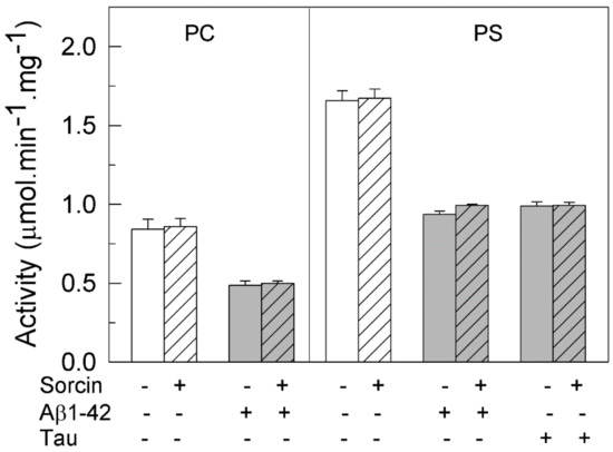 Sorcin does not to protect PMCA activity from its inhibition by Aβ and tau in the presence of EGTA. Purified pig brain PMCA (2.5 μg) reconstituted in PC or PS was treated for 2 min at 37 °C, with 2 mM EGTA, in the absence (plain bars) or presence of 1 µM sorcin (stripped bars) and 30 µM Aβ or 300 nM tau (grey bars) in 25 μL. The mixture was further diluted up to 1 mL in the assay medium (without Ca2+) and the reaction was started by addition of 1 mM ATP and 100 µM CaCl2. Data represent mean ± SE from three experiments performed in duplicate and with three different preparations.