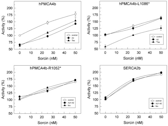 We have shown in previous work that hPMCA4b is the isoform most sensitive to inhibition by Aβ [29] and tau [27]. On the other hand, SERCA2b is ubiquitously expressed and is the predominant isoform in the brain [30,31]. Therefore, we examined the effects of sorcin in the presence of Aβ and tau, on Ca2+-ATPase activity of COS membranes overexpressing the native hPMCA4b, truncated variants hPMCA4b-L1086* (L1086*) lacking the calmodulin binding domain (CaMBD) and hPMCA4b-R1052* (R1052*), and the SERCA2b isoform. R1052* is the PMCA variant that most closely resembles SERCA, since it lacks the whole C-terminal domain. The reason for using truncated forms of PMCA was to determine whether the binding of sorcin to PMCA occurred in the C-terminal regulatory domain of PMCA, which does not contain SERCA, or in other domains. As shown in Figure 4, the activity of native hPMCA4b measured in the absence of sorcin was inhibited by Aβ and tau, whereas the activity of L1086* was inhibited only by tau. In contrast, neither Aβ nor tau affected the activities of the shortest R1052* variant and SERCA2b, confirming our previous findings [25,26].