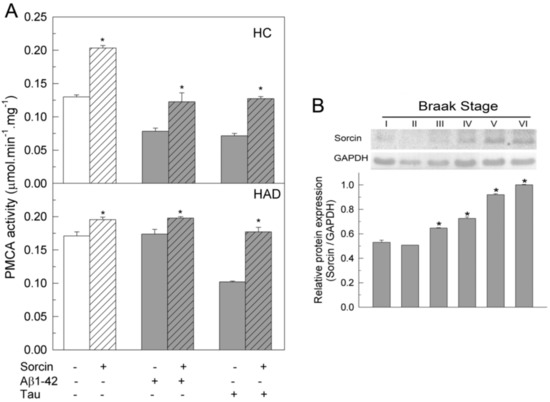 The effects of sorcin on PMCA were also investigated in membranes prepared from human undiagnosed (HC) and diagnosed AD (HAD) brains. Samples were treated, as described above, with 1 µM sorcin and 30 µM Aβ or 0.3 µM tau, in 25 µL, and then diluted to 1 mL in assay medium. PMCA activity was measured as indicated in the Methods Section and the resulting values are depicted in Figure 5A. It was observed that in HC, the addition of sorcin increased PMCA activity by 1.75-fold, while Aβ or tau, at the concentrations assayed, produced about 50% inhibition, as expected from the results of previous work. However, the activities of membranes co-treated with sorcin and Aβ or tau were similar to those of untreated samples. These results are in agreement with those observed in purified pig brain PMCA (see Figure 1). In HAD membranes, the PMCA showed higher activity than in HC membranes, as already reported in previous studies [26,29], and it was not significantly activated by sorcin. On the other hand, Aβ did not affect the activity of HAD membranes, whereas tau inhibited PMCA by 50%, as already reported in previous studies [26,29,32], but this inhibition was prevented by co-treatment of membranes with sorcin and tau. In order to determine the expression of endogenous sorcin in human brain samples, we performed Western blots of human membranes at different Braak stages (Figure 5B). An increase in sorcin expression was observed in the later Braak stages, associated with disease progression.