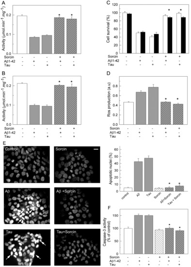 The protective effects of sorcin against the toxic effects of Aβ and tau were also studied in the human neuroblastoma SH-SY5Y cell line (Figure 6). Ca2+-ATPase activity assays (Figure 6A) showed 50% inhibition in membranes prepared from cells treated with 5 µM Aβ or 10 nM tau.