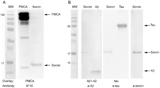 The activity results obtained with purified PMCA suggest that the protective effect of sorcin against Aβ or tau may result from its direct interaction with PMCA, thus blocking the binding of Aβ or tau to the pump. However, it is possible that sorcin also interacts with both AD markers, thus preventing them from binding to PMCA. Furthermore, sorcin is unable to diffuse across the cell membrane, while extracellular Aβ or tau can be internalized in cell cultures by endocytosis [33,34,35,36,37,38], producing toxic effects [25,39]. Therefore, the results shown so far strongly suggest that the protective effect of sorcin against PMCA inhibition by Aβ and tau and also against their cytotoxicities could be due to its interaction with exogenous Aβ and tau, preventing their entries into the cells and thus their toxic effects. To analyze these possibilities in detail, we carried out overlay tests. First, we analyzed the possible sorcin–PMCA interaction, and for this, they were loaded on a 10% SDS gel, transferred to a PVDF membrane (Figure 7A) and incubated with PMCA. After several washes to remove unbound protein, the membrane was stained with the 5F10 PMCA-antibody. A representative blot showed clear binding of 5F10 antibody to the 22 kDa sorcin on the first membrane, indicating that PMCA interacts with sorcin.