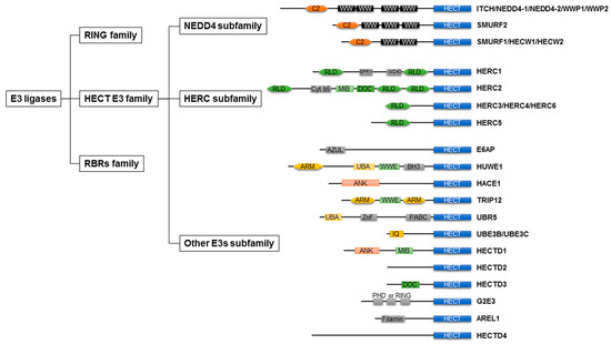 As shown in Figure 1, E3 ligases are classified into three groups: really interesting new genes (RING), homologous to E6AP C-terminus (HECT), and RING-between-RINGs (RBRs). The domain architecture and mechanism of ubiquitylation depend on the class of E3 ligases [31].