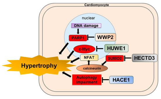 This study shows the current understanding of HECT-type E3 ligases in the development of cardiac hypertrophy. An overview of HECT-type E3 ligases in cardiac hypertrophy is summarized in Table 1.