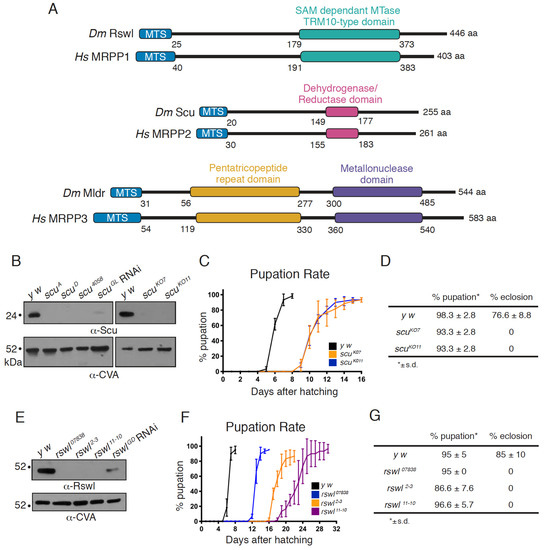 Since mitochondrial disease presentation is complex and multisystemic, model systems are a useful tool to dissect the in vivo role of MRPP1, 2, and 3 in mt:tRNA processing during development. We previously identified the Drosophila homologs of MRPP1 (Roswell (Rswl)) and MRPP2 (Scully (Scu)) and MRPP3 (Mulder (Mldr)) (Figure 1A) [29]. In Drosophila, all three proteins associate with each other and localize to mitochondria [29].