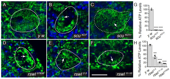 Loss of function of rswl and scu are associated with mitochondrial defects. (A–F) Neuroblast (NB) stem cells (dotted outlines) from larval brains labeled for mitochondria (green) and DAPI (blue). Neuroblasts in wild-type (y w) brains had small, dispersed mitochondria (A). In contrast, mitochondria in the neuroblasts of rswl and scu mutants (B–F) were swollen and ring-shaped (arrows). Number of NB with swollen mitochondria = 1/56 (A), 71/80 (B), 29/30 (C), 19/19 (D), 15/17 (E), and 22/25 (F). (G,H) Total relative ATP levels were reduced in scu (G) and rswl (H) mutant larvae. Green: anti-ATP synthase; blue: DAPI. Scale bar: 10 mm in F for A–F. Error bars: S.E.M. calculated using GraphPad PRISM using an unpaired t-test, two-tailed. (G, H). **** p < 0.0001; *** p < 0.001.