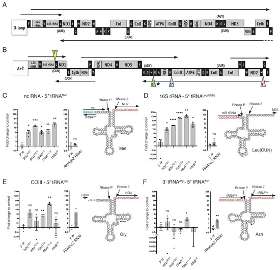 Mutations in mtRNase P complex proteins differentially affect mt:tRNA 5′-end processing. (A,B) Linear schematic of human (A) and Drosophila (B) circular mtDNA. Protein coding regions (mRNA) and ribosomal RNA (rRNA) are depicted in grey, whereas mt:tRNAs are in black. Both mtDNAs encode the same products in a slightly different order. Arrows indicate polycistronic transcripts, with humans containing three and Drosophila, five. The non-coding regions that control replication (human and Drosophila) and transcription (human) are the displacement (D) loop and the A+T region that is rich in adenine and thymine. The mt:tRNA 5′-ends tested are indicated with colored triangles (B). The asterisk indicates a junction that could also be recognized and cleaved at the mt:tRNA 3′-end. (C–F) Graphs representing the log2 fold change in qPCR levels and the corresponding predicted mt:tRNA cloverleaf structure for mt:tRNA 5′-end canonical junctions between (C, pink triangle) non-coding (nc) RNA: 5′ tRNAMet; (D, yellow triangle) 16S rRNA: 5′ tRNALeu(CUN); (E, blue triangle) COIII: 5′ tRNAGly; (F, green triangle) 3′ tRNAArg: 5′ tRNAAsn for scu, rswl, mldr, and UAS-RNaseZ RNAi mutant larvae. The arrow within each tRNA diagram indicates the internal primer start site for qPCR analysis. The red circled nucleotides represent 5′ -> 3′ mtRNA, and the blue represents mt:tRNA encoded on the opposite strand. Bars on the graphs represent averaged 2^ddCt, and the y-axis is log2. Further explanation can be found in the materials and methods. The statistical significance was calculated relative to control (y w). Error bars: S.E.M. calculated using GraphPad PRISM using an unpaired t-test, one-tailed. * p < 0.05; ** p < 0.01; *** p < 0.001; **** p < 0.0001; ns: not significant.